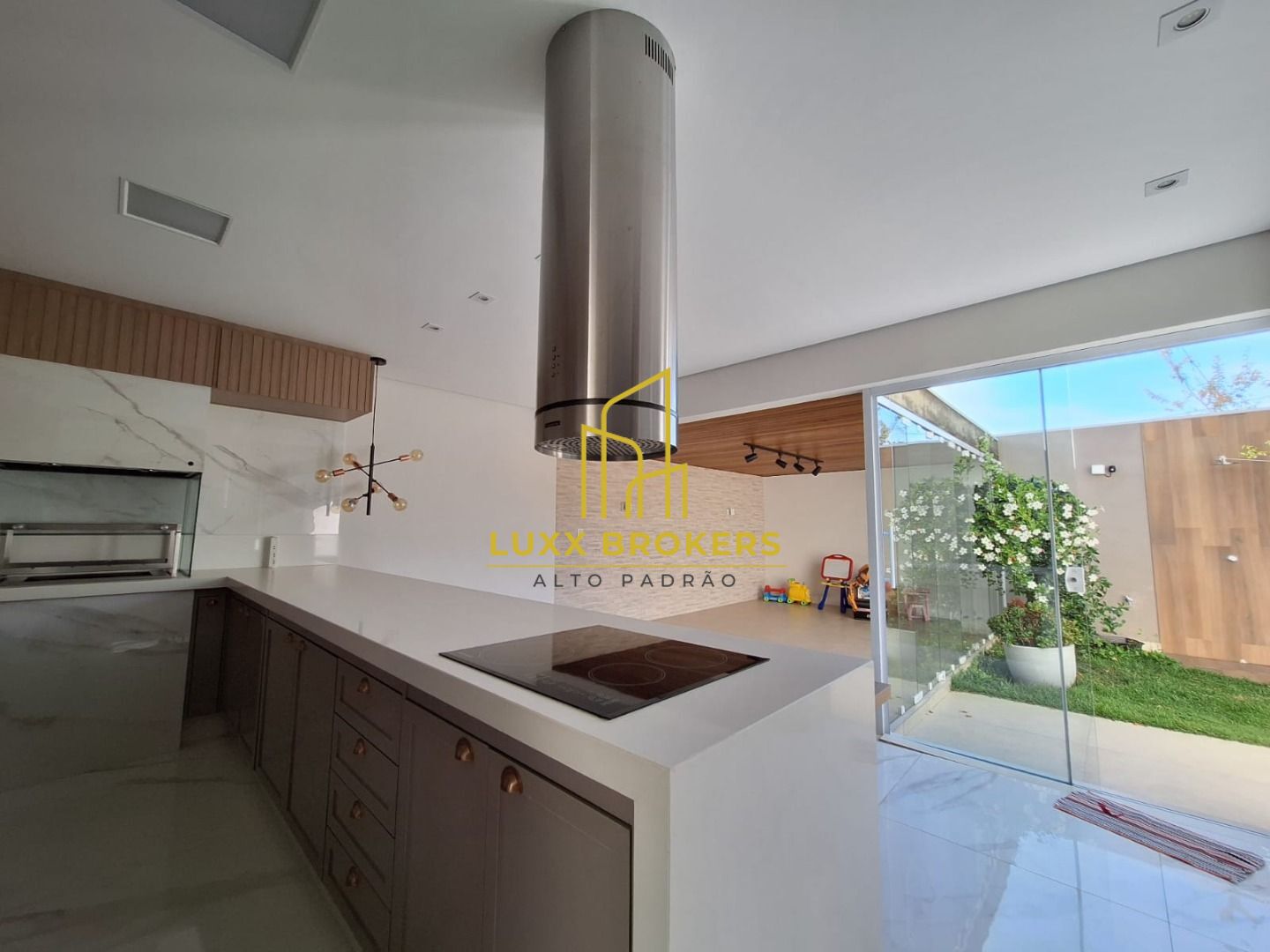 Piso inferior com cozinha planejada integrada com a sala de estar e jantar, lustres, painel para tv, ar condicionado, área de serviço separada com armários , área externa coberta, lavabo, ampla área gourmet com churrasqueira, pia, armários, painel com tv, amplo jardim com espaço para construir piscina, espaço para academia com ar condicionado e armário, uma suíte com banheira de hidromassagem e armário.
