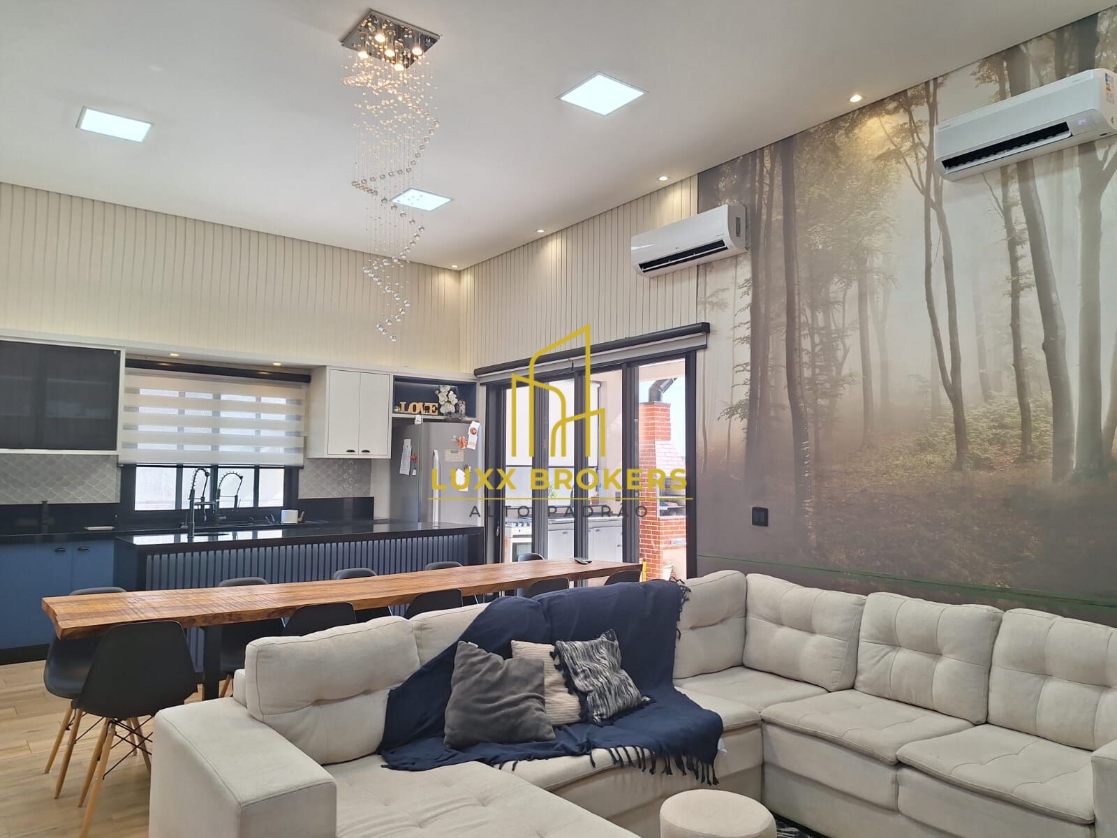 Casa conta com 3 entradas, uma principal que da acesso a casa no pavimento superior , uma lateral que acessa o jardim e uma entrada interna pela garagem, no piso superior possui sala ampla com pé direito duplo de 4 metros, ar condicionado de 12 mil BTU, cozinha planejada integrada com a sala de estar e jantar, sendo equipada com torneira de agua quente, armários, fogão de indução, porta balcão integrada com área gourmet e quintal, persianas motorizadas, ar condicionado de 18 mil BTU, lavanderia, lavabo, um escritório que pode ser utilizado como dormitório tendo vista para a mata preservada, 3 quartos amplos, sendo 2 com porta balcão motorizada que dá acesso ao quintal, um deles com ar condicionado de 9 mil BTU, banheiro social com torneira aquecida e gabinete, 1 suíte com closet fechado, porta balcão motorizada, e amplo banheiro com pias duplas, torneiras aquecidas e banheira de hidromassagem, área gourmet com churrasqueira, pia e gabinete com amplo quintal e gramado.