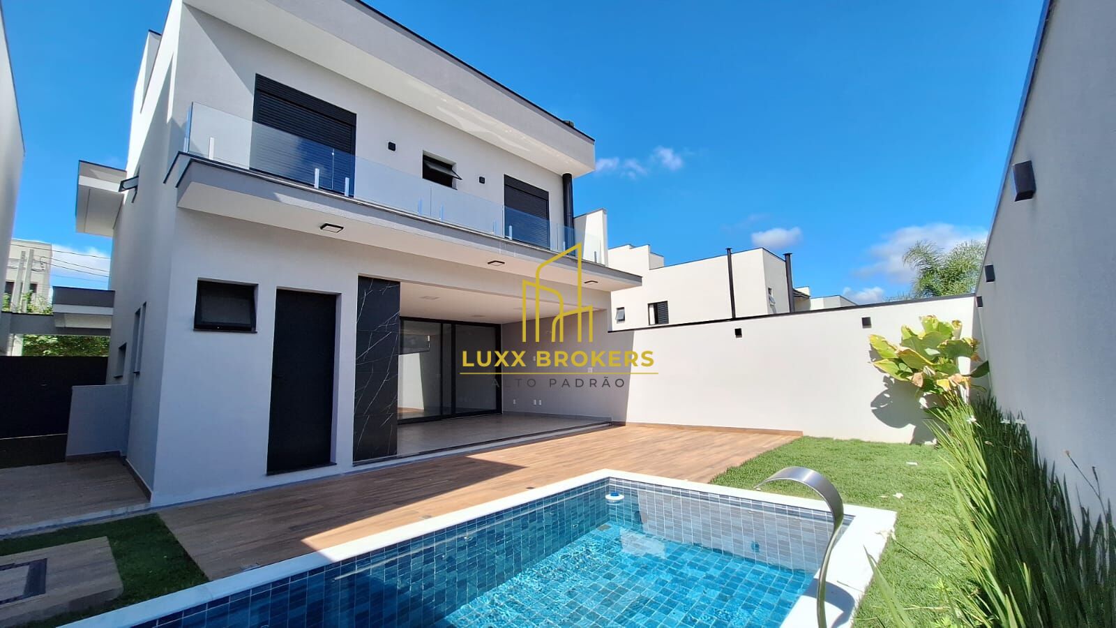 Piso inferior tem cozinha integrada com a sala de estar e jantar com pé direito duplo, despensa, lavanderia com entrada individual, esta belíssima residência possui uma área construída de 200m², além de contar com espaço gourmet com churrasqueira, piscina, banheiro externo, infraestrutura para ar condicionado na casa toda, garagem para 4 carros sendo 2 cobertas.