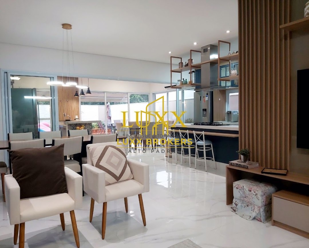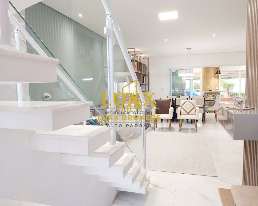 Lindissima casa Piso superior: 03 suítes, sendo uma master com closet, painel para TV, banheiro com dupla cuba, banheria de hidromassagem com vista 100% privativa para linda área verde e ampla sacada. Armários, ar condicionado e piso de vinilico. Sala íntima/escritório. Piso inferior: Lavabo com pia em marmore branco e metais em rose gold Sala de TV com painel Sala de jantar Cozinha com armários, pedras em mármore silestone branco estrelar, ilha, cooktop, coifa, microondas e forno elétrico. Área gourmet com balcão, pia e churrasqueira. Toda com fechamento em vidro e ar condicionado. Piscina com aquecimento solar, deck em madeira, banheiro de apoio. Toldo com sistema elétrico. Casa com fino acabamento e aquecimento solar. Condomínio com área de lazer: piscina adulto e infantil, quadra, salão de festas, churrasqueira com forno a lenha e pizza, academia, brinquedoteca, academia ao ar livre e estacionamento para visitantes. Bairro com excelente estrutura de serviço. Fácil acesso as Rodovias Anhanguera, Bandeirantes e Dom Gabriel