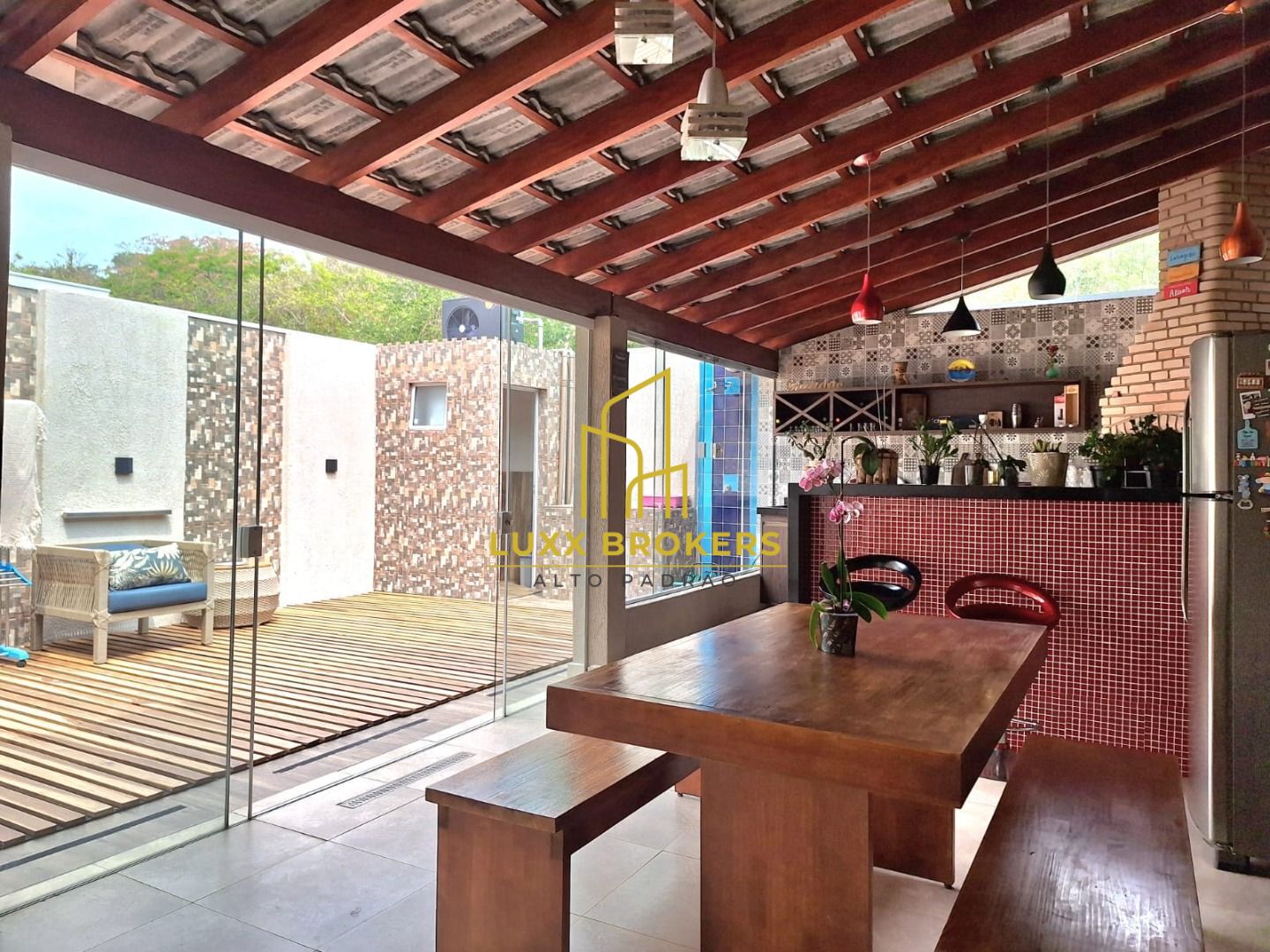 Piso inferior possui cozinha planejada com armários e eletrodomésticos embutidos,sala de estar e jantar com estante para TV, ar condicionado, lavanderia, espaço gourmet coberto com churrasqueira, cooktop, bancada em ilha, pia de apoio, mesa de madeira com bancos, fechamento em vidro, área externa com piscina aquecida de 7 X 3.4 metros com aquecedor elétrico e deck de madeira removível com suporte acima de 500Kg, energia fotovoltáica com 8 placas e será instalado mais 2 gerando assim energia suficiente para suprir o consumo da casa e aquecimento da piscina com tranquilidade.